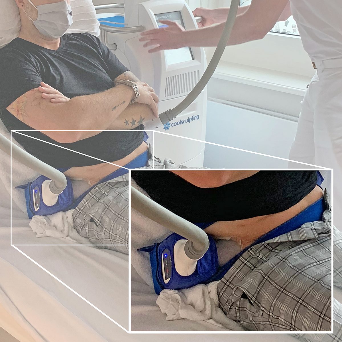 Das Kühlelement der CoolSculpting Maschine wird exakt auf die eingezeichnete Zone angesetzt und kühlt nun mit seinen -11 Grad die zu behandelnde Region kontrolliert und regelmässig während ca. 45 Minuten (1 Behandlungszyklus) runter. Anfangs kribbelt es etwas, aber danach spürt man nichts mehr und kann sich während der Behandlung bei Musik oder einem Buch entspannen.
